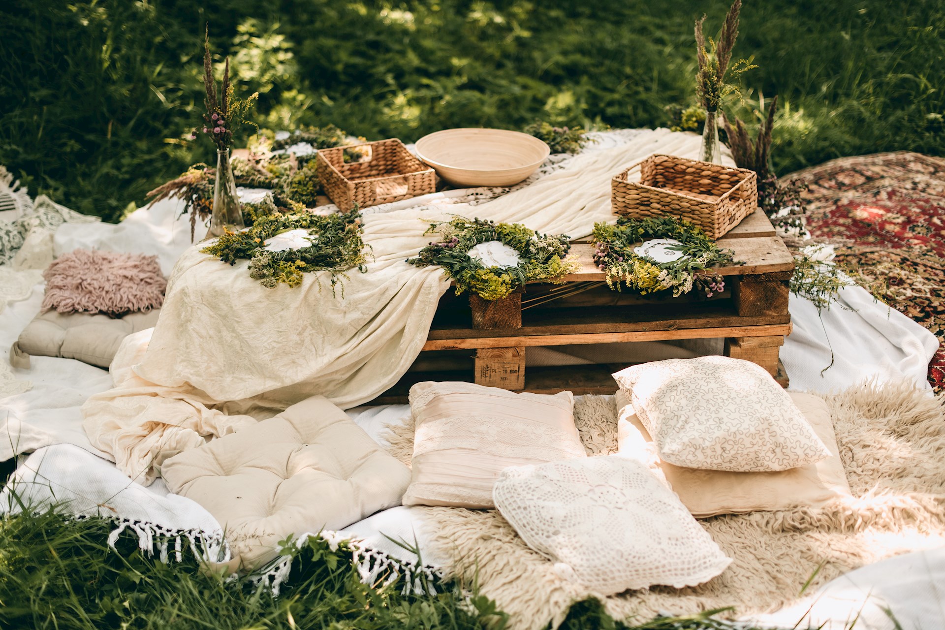 Nailing a combination of décor and comfort will be key for making your time more enjoyable. Using a picnic blanket that is partially waterproof or putting down a waterproof sheet first will stop any wetness from the ground below from seeping through and ruining the experience. It may also be nice to use cushions to sit on to enhance comfort. On Pinterest the use of wooden pallets is popular to act as a table to put food onto which is a nice idea and adds to the aesthetic too!